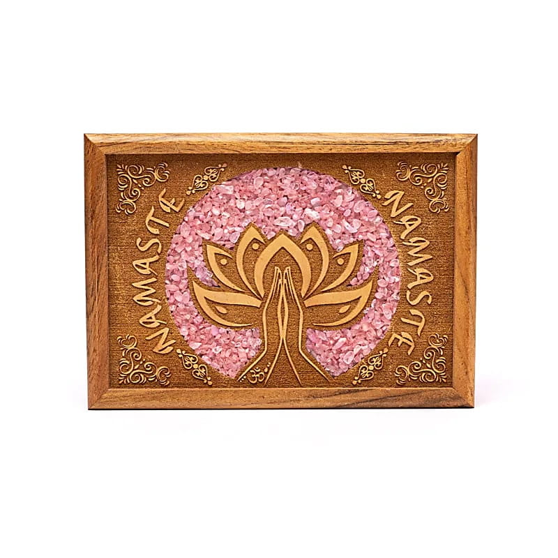 Kompaktowe pudełko do przechowywania wykonane z drewna mango, z wygrawerowanym słowem "Namaste" i wykończone kwarcem różowym. Subtelne, symboliczne miejsce do przechowywania biżuterii, kart lub innych przedmiotów osobistych.